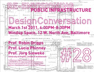 UVA Faculty Robin Dripps, Lucia Phinney and Jorg Sieweke invited to discuss their recent research on public infrastructure in the D:Center in Baltimore’s Station North District WindUp Space. Check B’More Green Blog covering/commenting on the event.