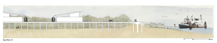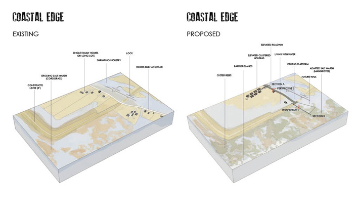 Small coastal communities will be able to continue historic inhabitation patterns by adapting housing typologies to a watery, dynamic environment. These fishing communities will be clustered behind the protection of barrier islands and natural levees and boating will be the primary mode of transportation in these areas. The mangroves will provide a new habitat to many species of fish and birds, which will aid in sustaining small commercial fishing operations in the area.