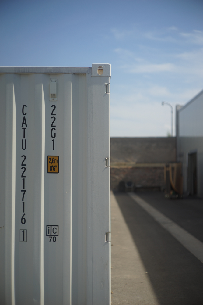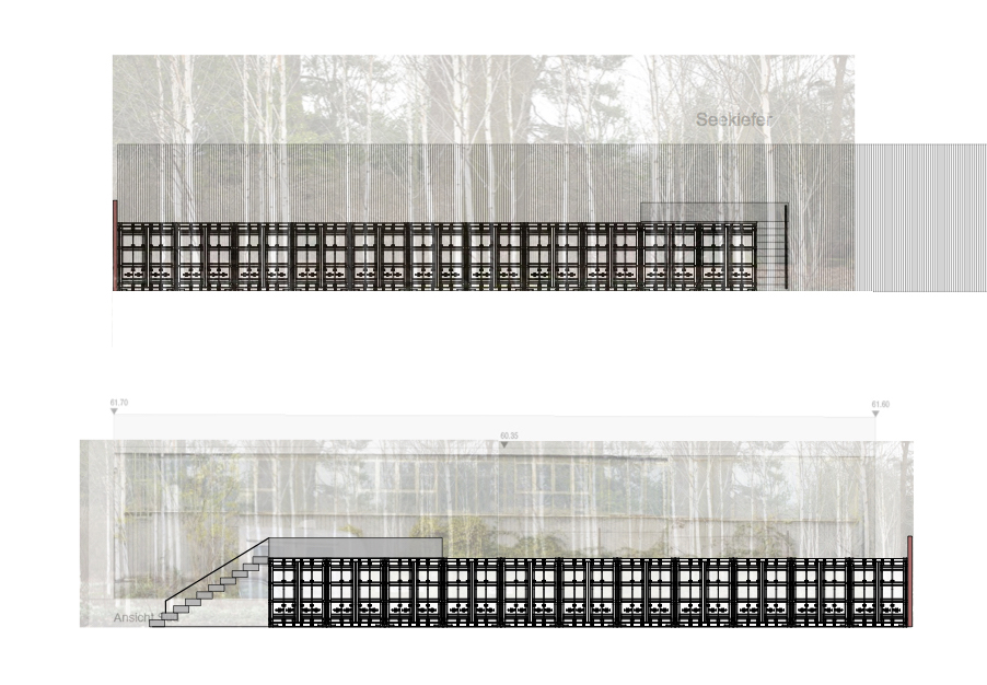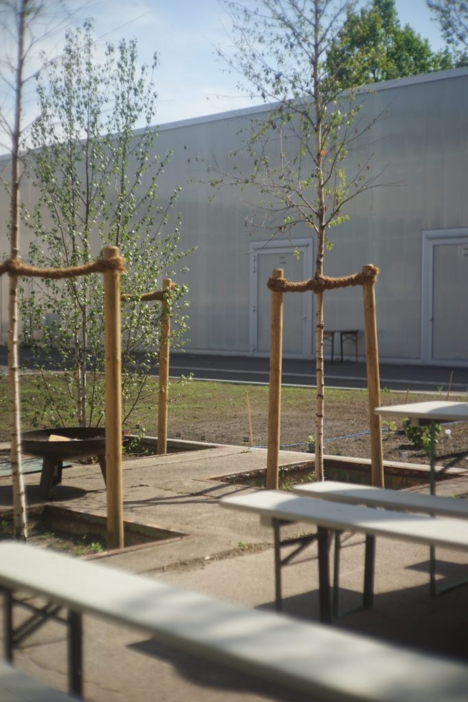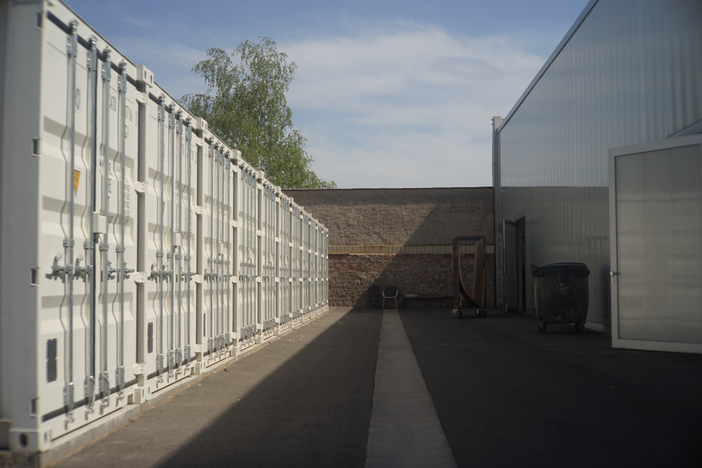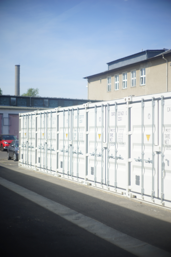 The commission asked for additional storage space offering an opportunity for restructuring the courtyards in necessary access in the front and a hortus conclusus in the back designated for substituting the pavement into a birch grove. Eleven shipping containers were placed into the southern courtyard and provide a deliberate juxtaposition in material and color to the translucent polycarbonate façade of the adjacent workshop building by Brandlhuber.
