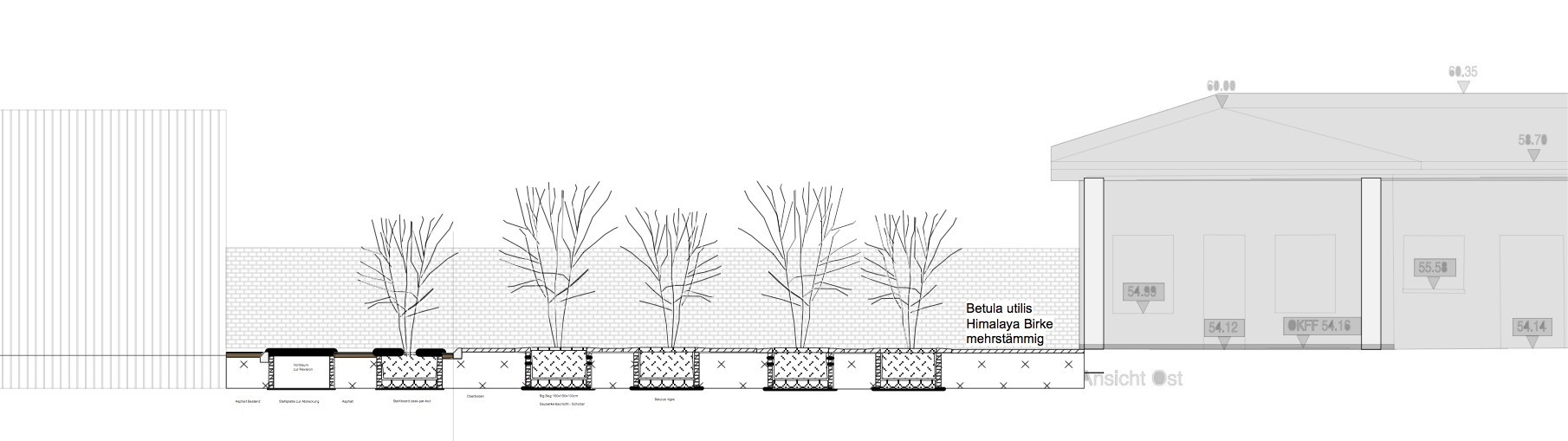 Another requirement is to compensate the impact of the atelier building. In the adjacent former Gas station site a set of six underground manholes for maintenance of defunct underground petrol tanks are remediated and the volume of the manholes turned into planters for river birches. This provides a social open space for the employers and visitors of the site to meet.