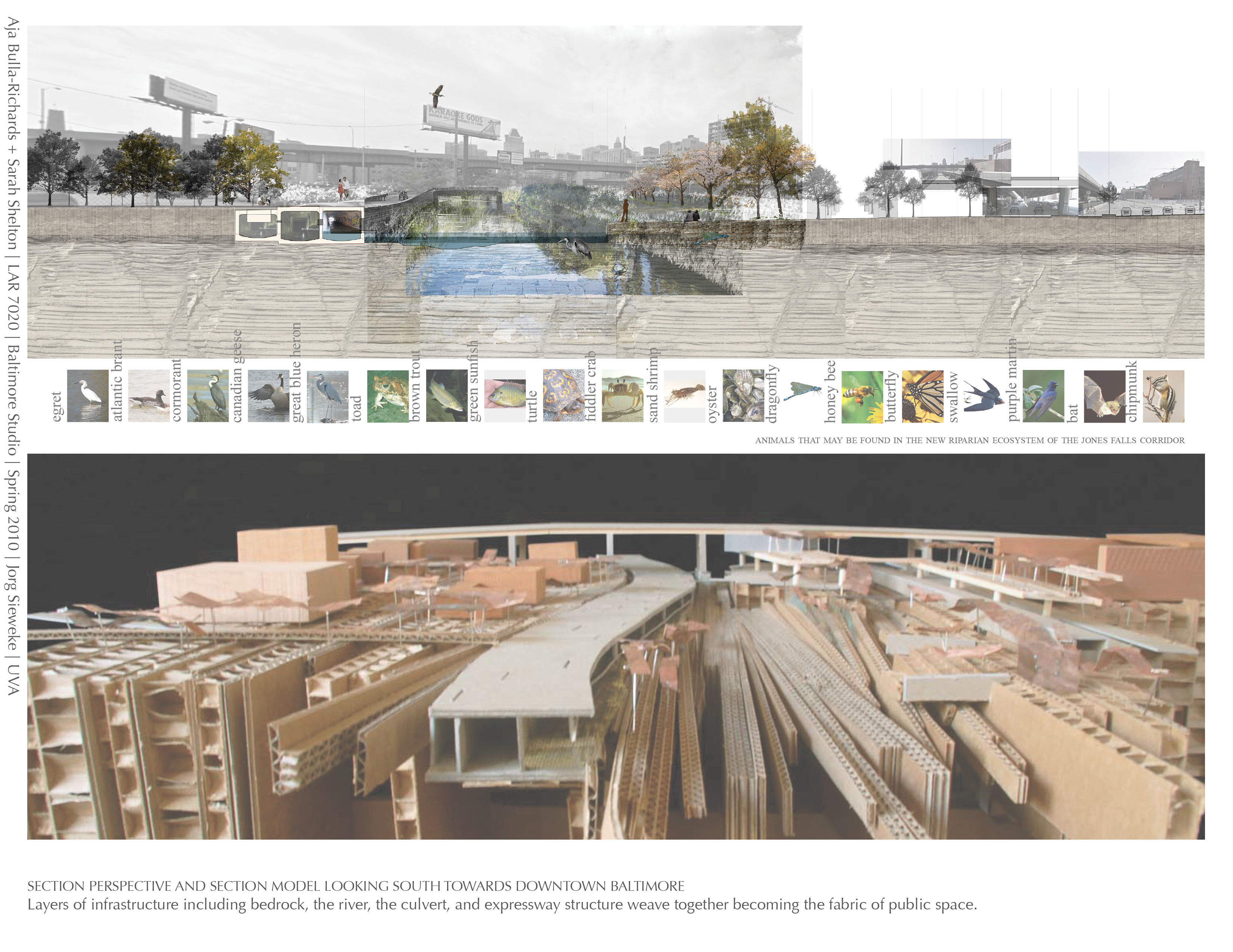 This project transforms mono-functional infrastructure into multi-functional systems, addressing storm water issues and creating an identity for the largely uninhabited corridor that bisects Baltimore, Maryland. The unique space proposed is comprised of a series of wetland parks, formed through revealing and adapting the layered history of the Jones Falls River and expressway. Once buried and problematic infrastructure is re-interpreted as regenerative space that supports ecological and cultural functions, engaging both sides of the city.