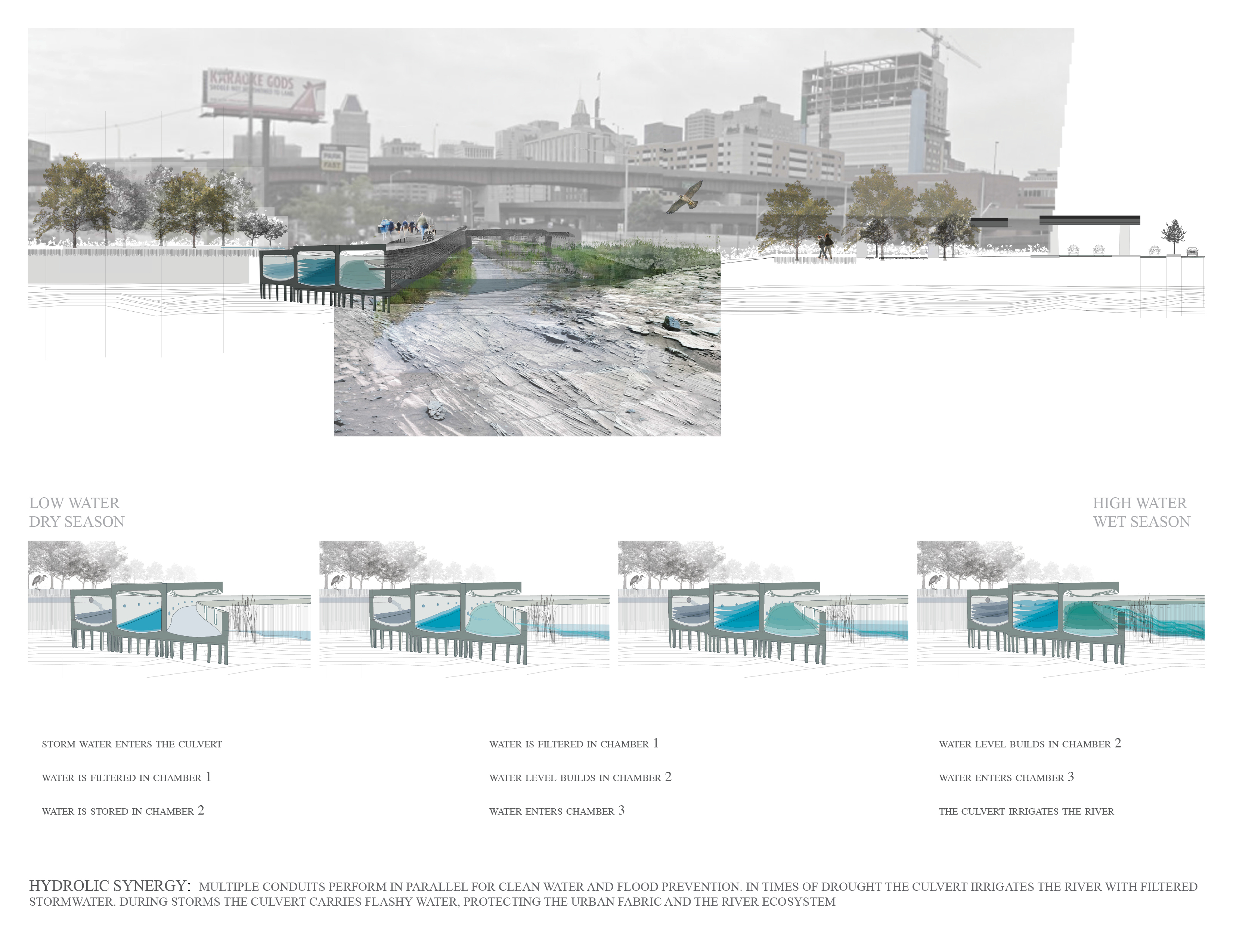 The Baltimore harbor suffers from very poor water quality; this is an ecological, cultural, and economic concern. The lower Jones falls watershed encompasses 58 square miles, composed primarily of highly impervious urban land. Currently the pollutants and trash that enter the stormwater in this region converge within the culvert and are released into the heart of Baltimore’s primary tourist attraction, the inner harbor. The ecology of the larger Chesapeake Bay is threatened by contaminates from the matrix of tributaries, such as Jones Falls that feed its waters. In this project the urban fabric of Baltimore is considered as part of this larger estuary system.
