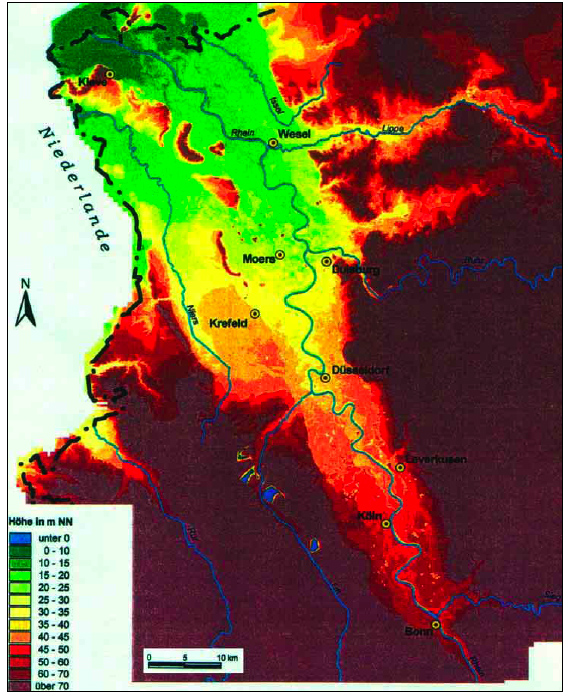 The Rhine is now largely channeled. Its former sprawling system of main and side arms and riverside meadows has »shriveled«. The river is restricted to a one high-water stream running between terraced banks. The side arms which meandered through the lowland have disappeared. These lowest-lying areas are subject to recurring flooding. In spite of this, they are partly built up, in places also with factories such as in Wesseling.
