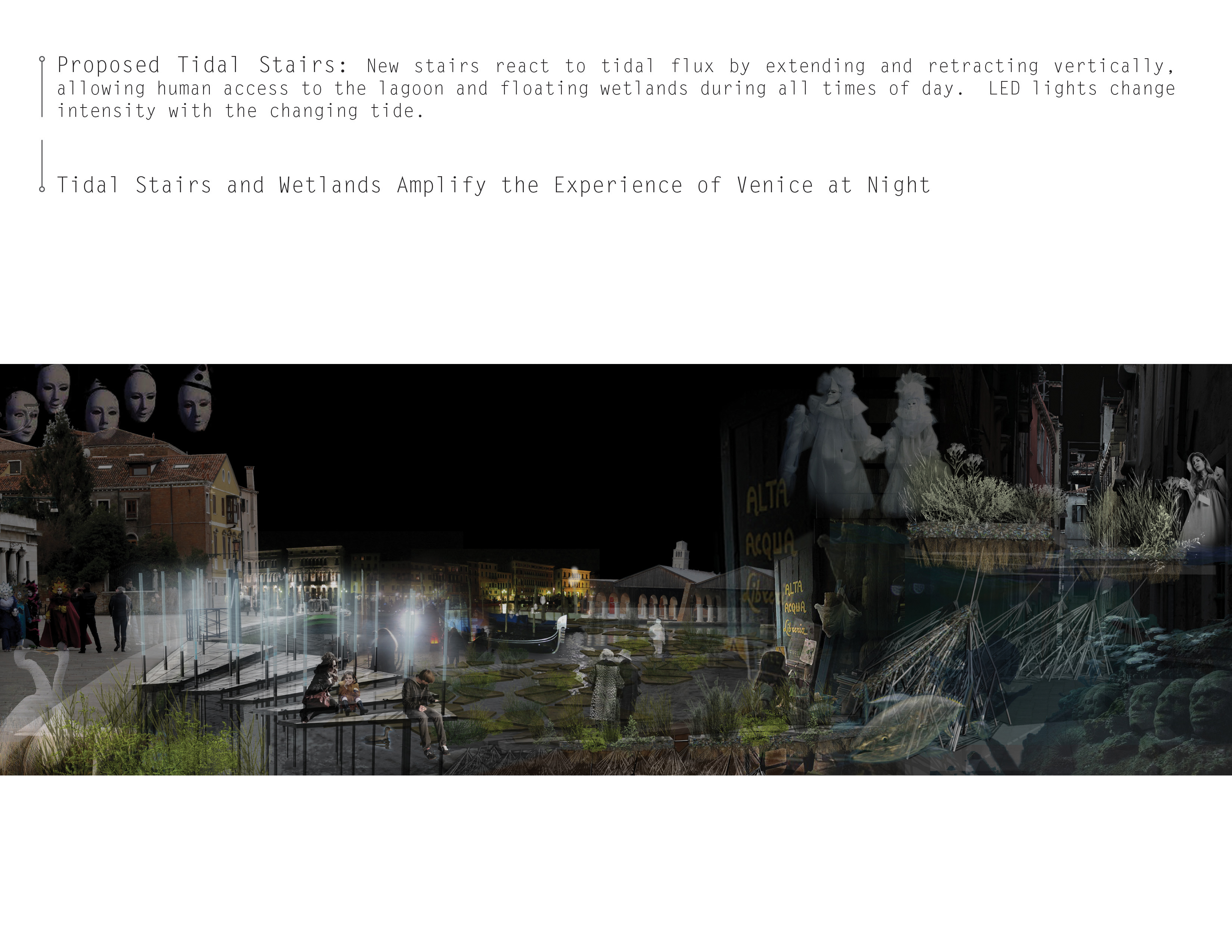 Campaigns to fight the increasing occurrence of flood, or acqua alta, have focused on centralized interventions — massive flood barriers (the MOSE project) at each of the lagoon’s three mouths to combat the inevitable. This heavy-handed approach is akin to the major river diversions that first reversed the morphological trend, and it fails to recognize the rich Venetian history of dispersed smaller-scale adaptations and management practices that governed the daily existence of Venice and her lagoon: floating mills that could be moved to take advantage of shifting wind and tidal patterns, managing wetlands and salt marshes for continued production of salt and maintaining a diversity of marine and avian species, emerging technologies for supporting and building ground, and complex networks of circulation. This proposal builds on this tradition of understanding and adapting and encourages the reimagining of Venice as a more connective place where social and environmental health are seen as inextricable parts of a comprehensive lagoon ecosystem.